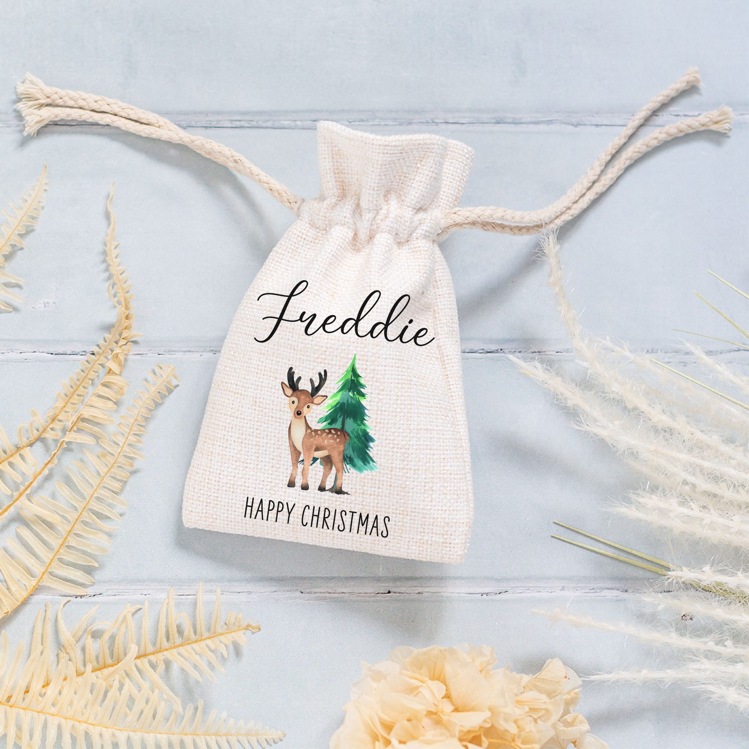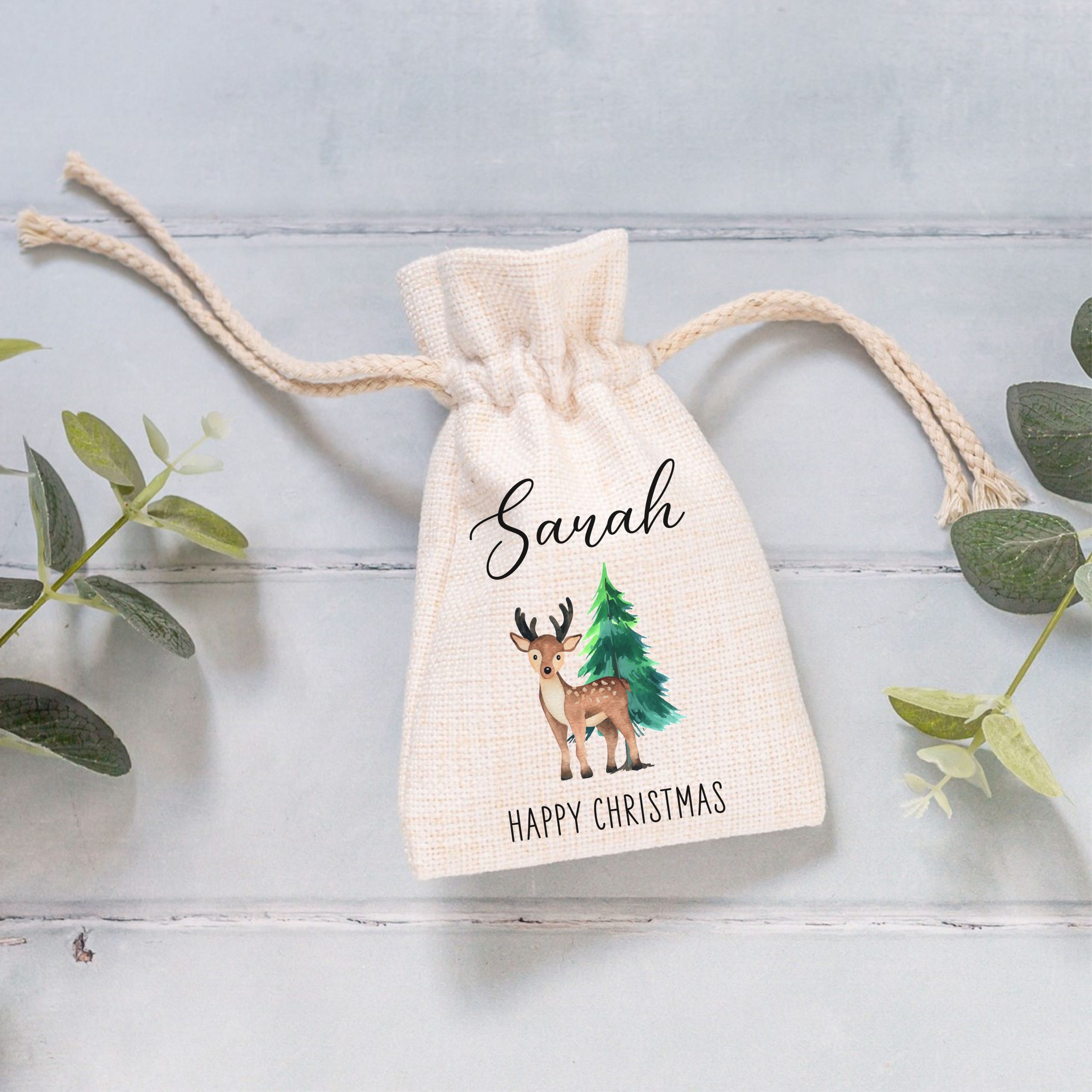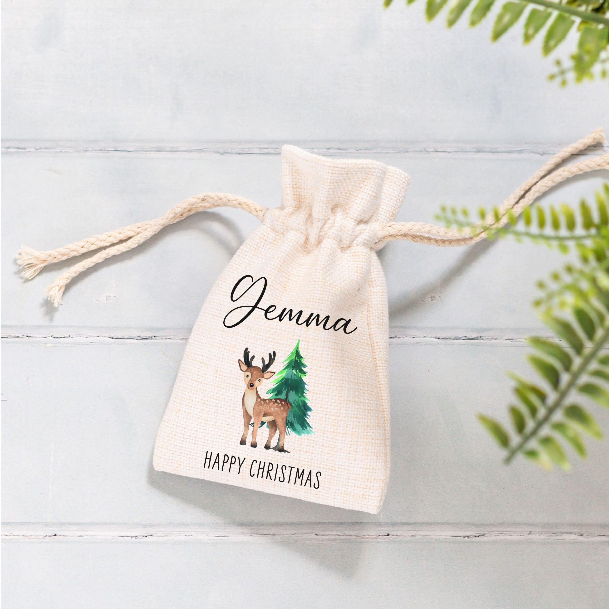 Personalised Happy Christmas Deer Linen Drawstring Gift Bag – Secret Santa Gift Bag