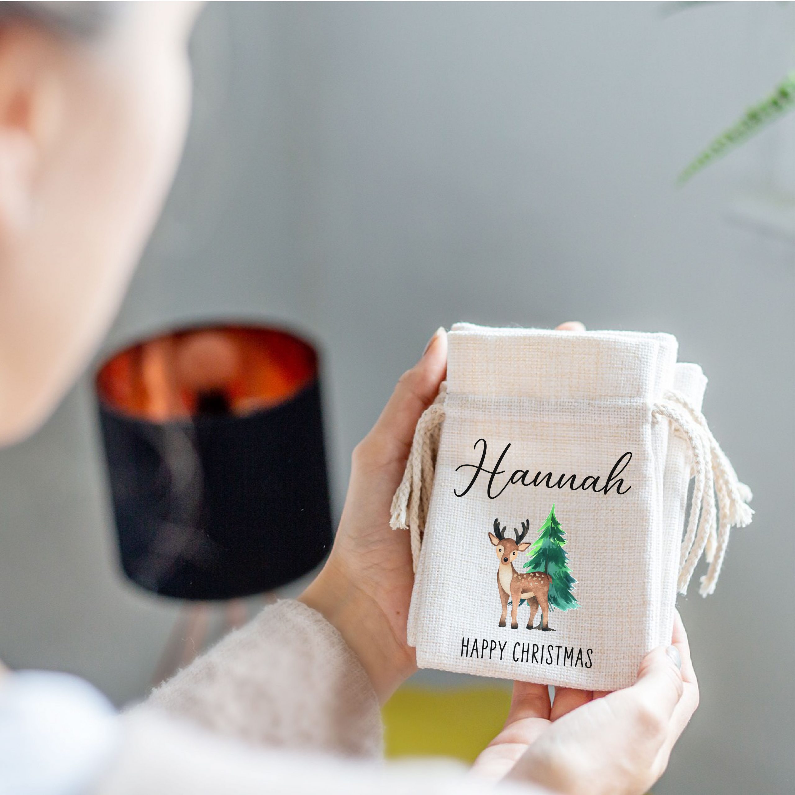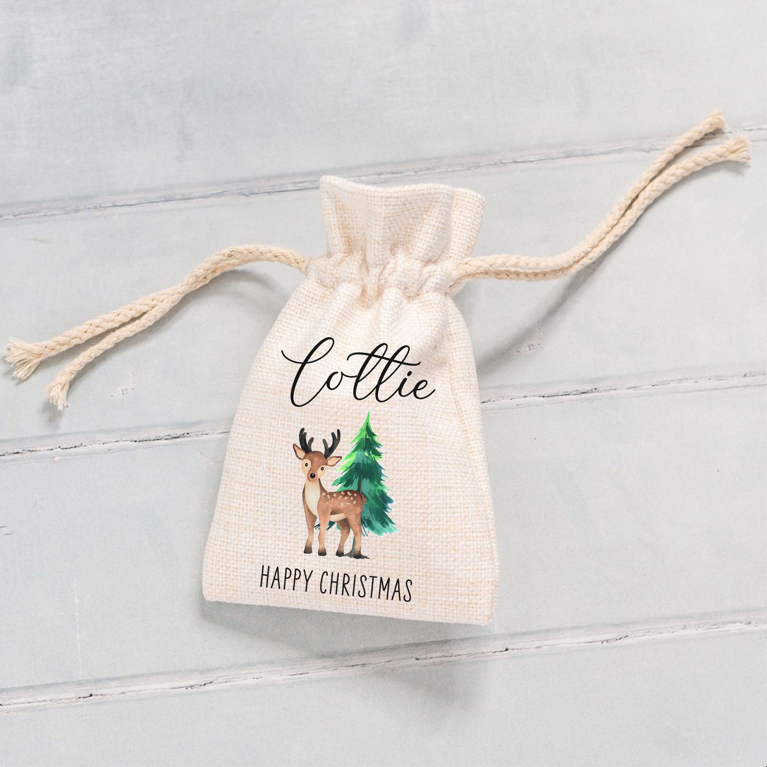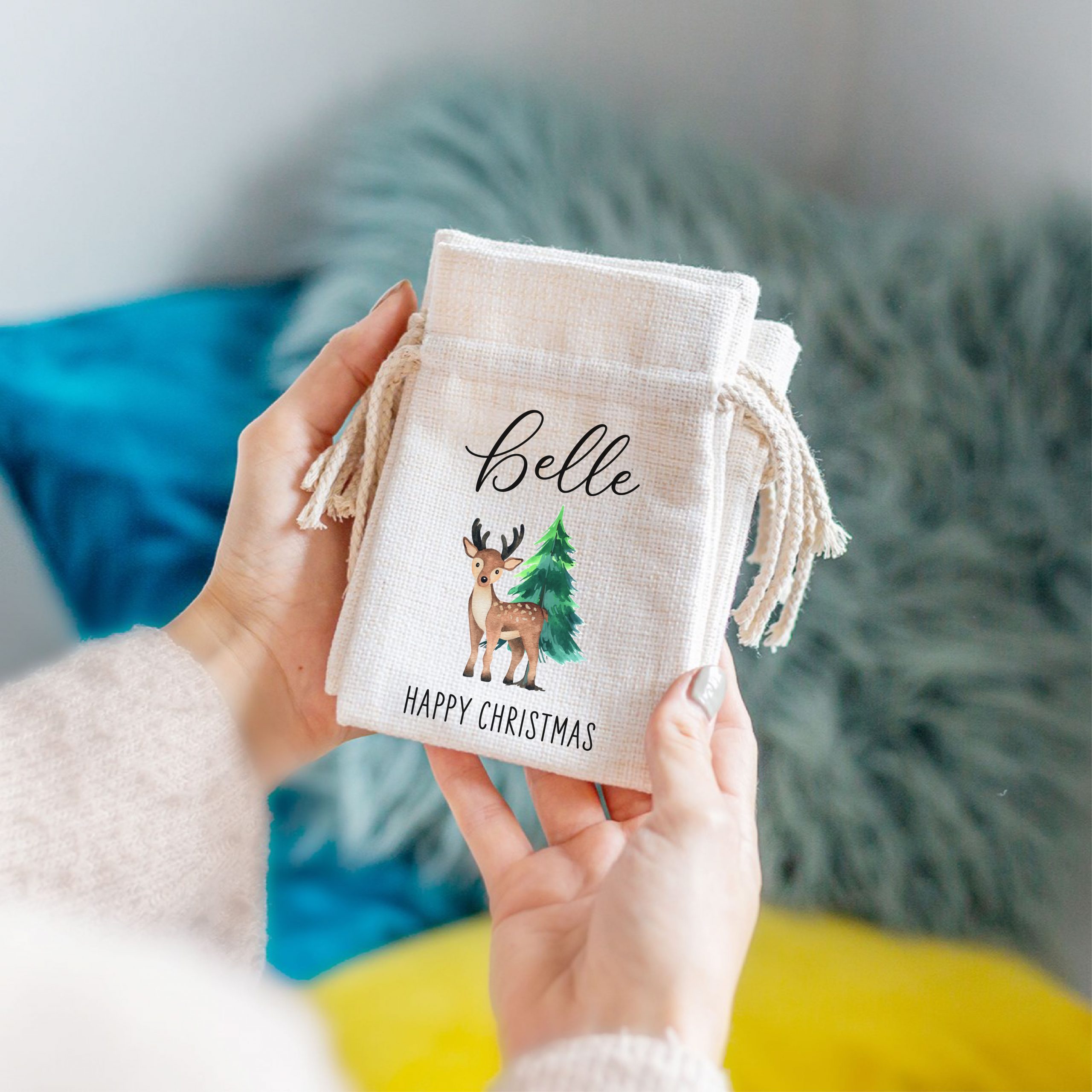 Personalised Happy Christmas Deer Linen Drawstring Gift Bag – Secret Santa Gift Bag
