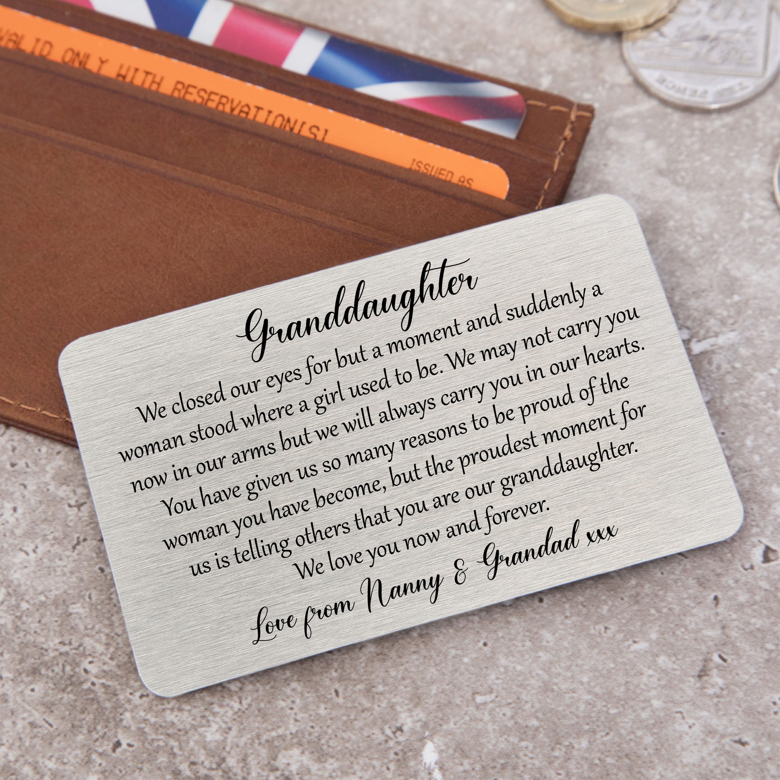 Remind your granddaughter how loved she is and how proud you are by presenting her with a metal wallet card.