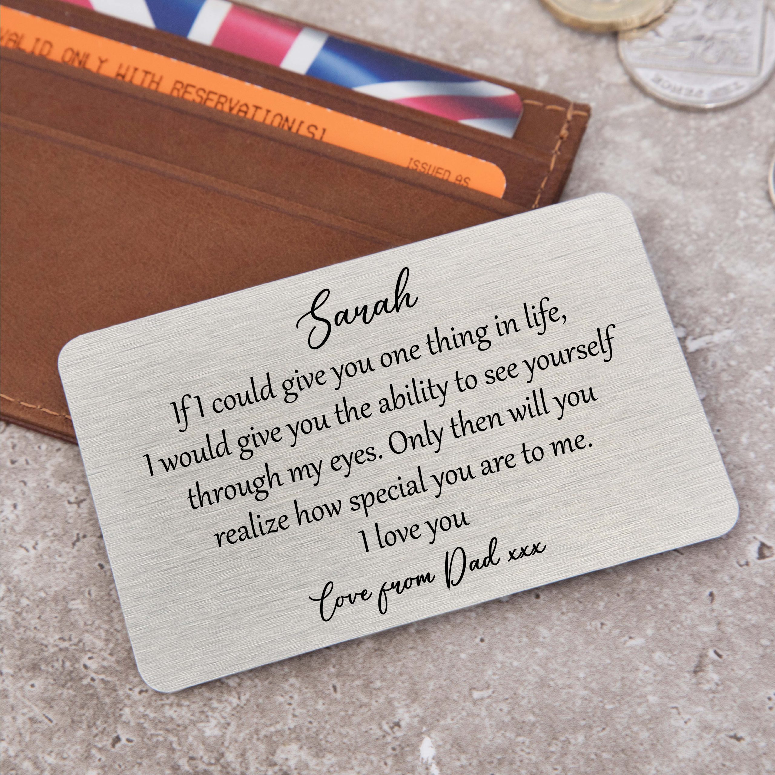 Remind your husband, wife, boyfriend, or girlfriend how loved they are and how proud you are by presenting them with a metal wallet card.