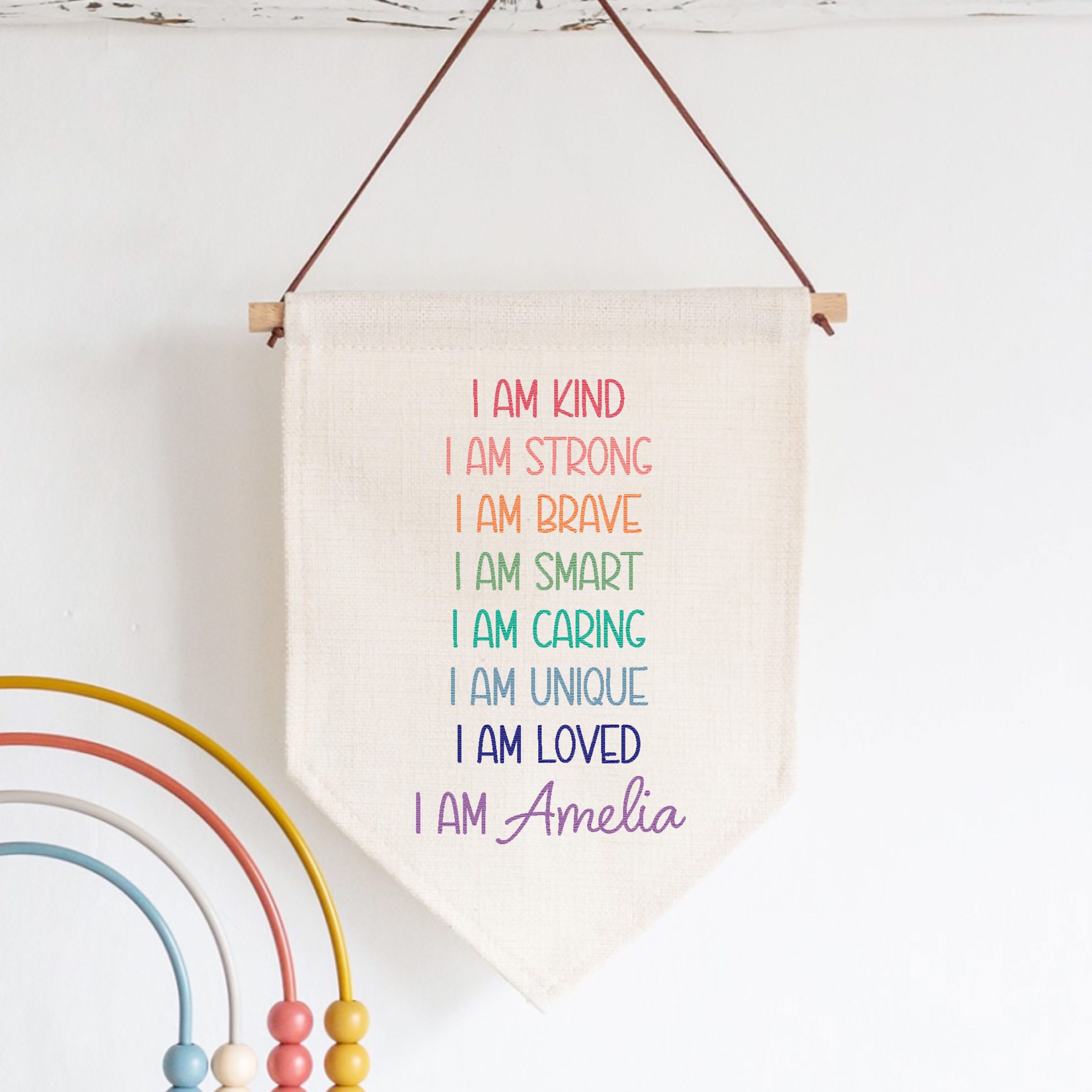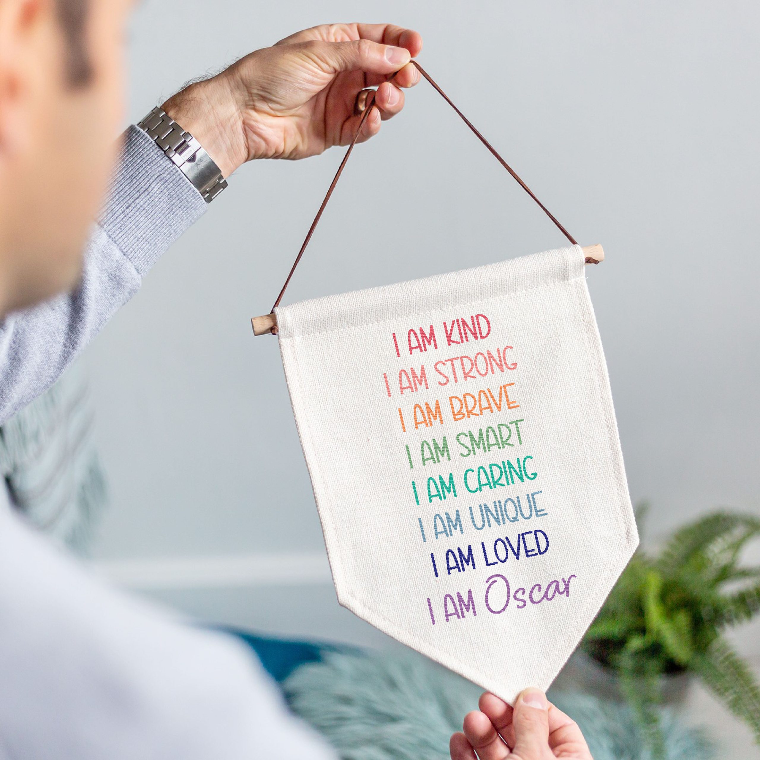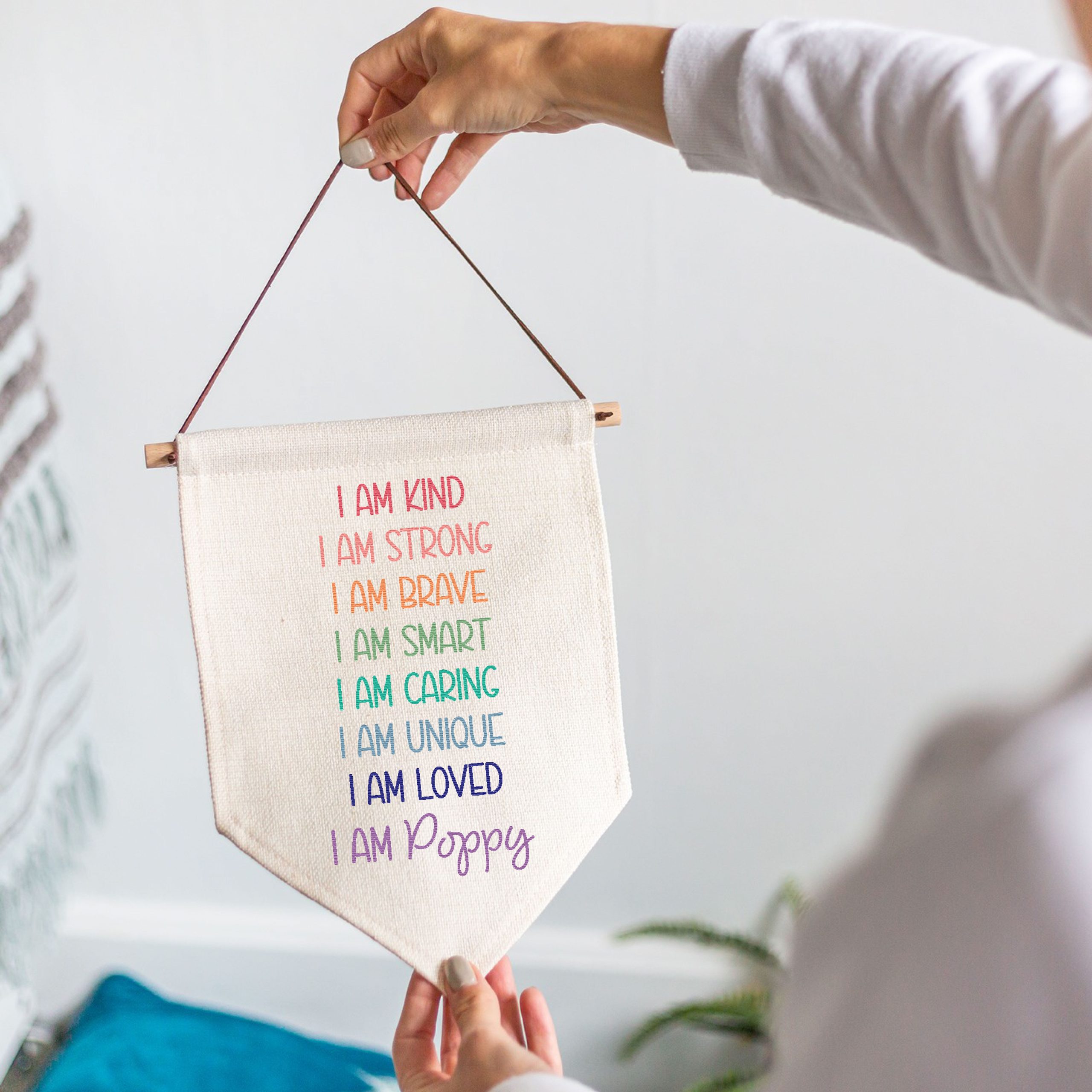 This unique and thoughtful personalised gift is a beautiful way to show a special girl how much she is loved. Made with high-quality linen-style polyester, this custom flag features a powerful message of self-belief and positivity that will inspire her every day. Perfect for a birthday, starting school, or as a new bedroom decoration, this wall hanging is a meaningful keepsake for a daughter, granddaughter, or niece that celebrates her uniqueness. ✨