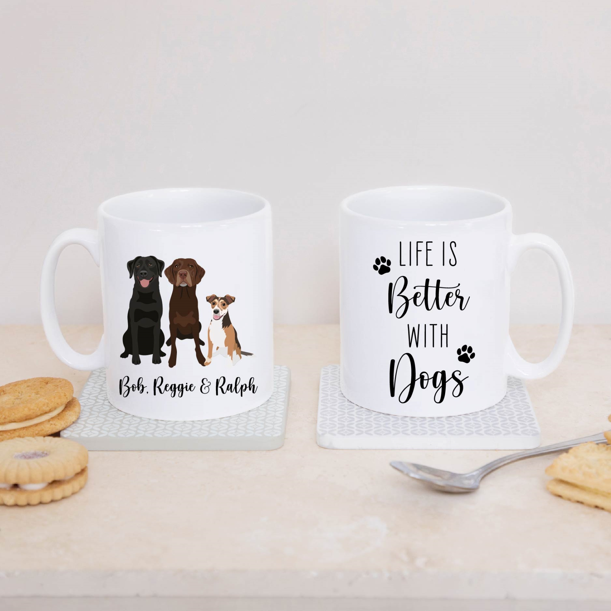 The “life is better with dogs” text is printed on the side of the mug facing the holder when held with their right hand. The images of the dogs & names are printed on the opposite side (unless requested otherwise).