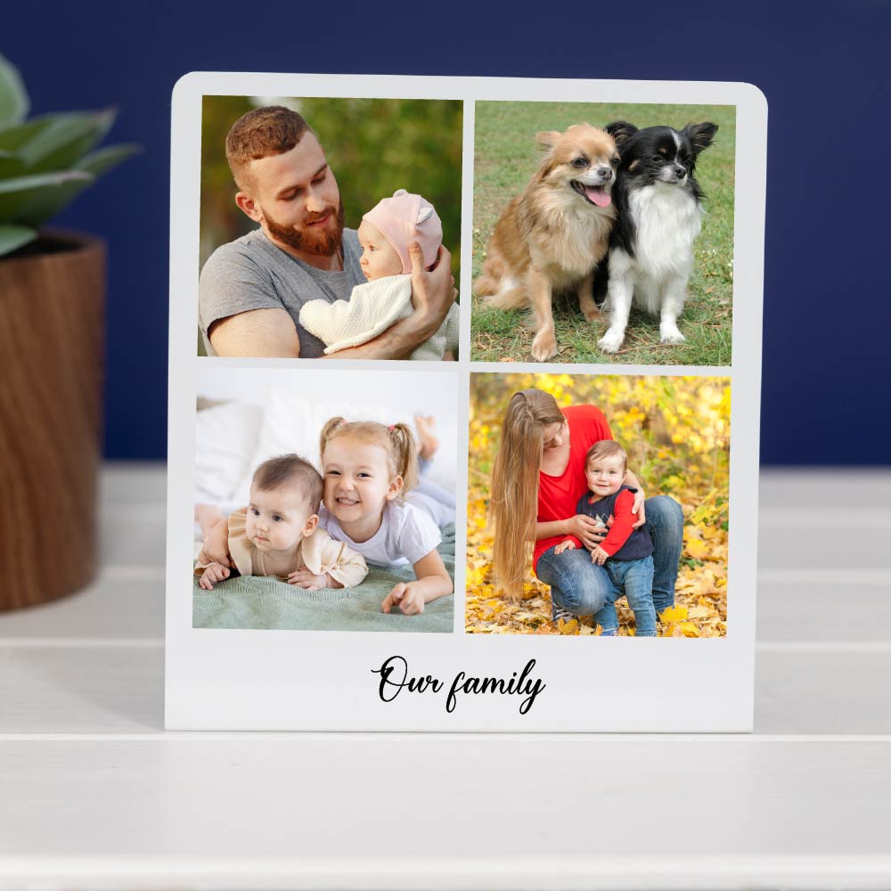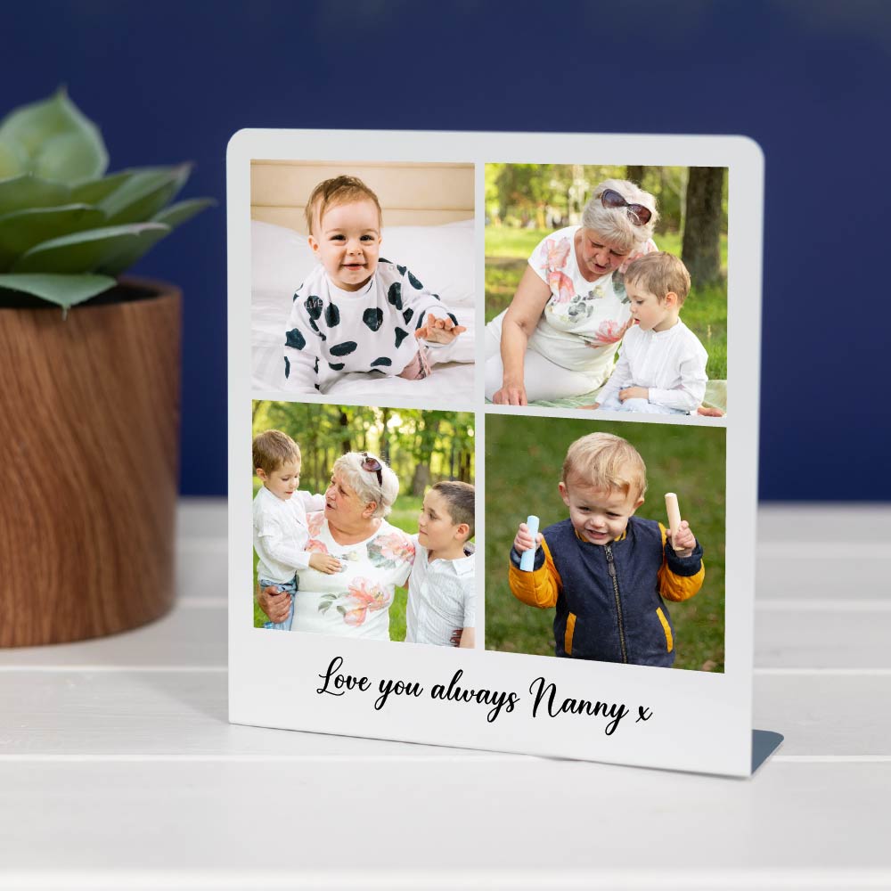 This custom freestanding picture frame is more than just a desk accessory; it’s a heartfelt keepsake designed to celebrate family bonds and special moments. Imagine their delight as they unwrap a gift featuring 4 treasured photos and a personal message, making it truly unique and unforgettable. Perfect for any occasion, this glossy aluminium desk print offers a high-quality, sentimental touch to any home or office.