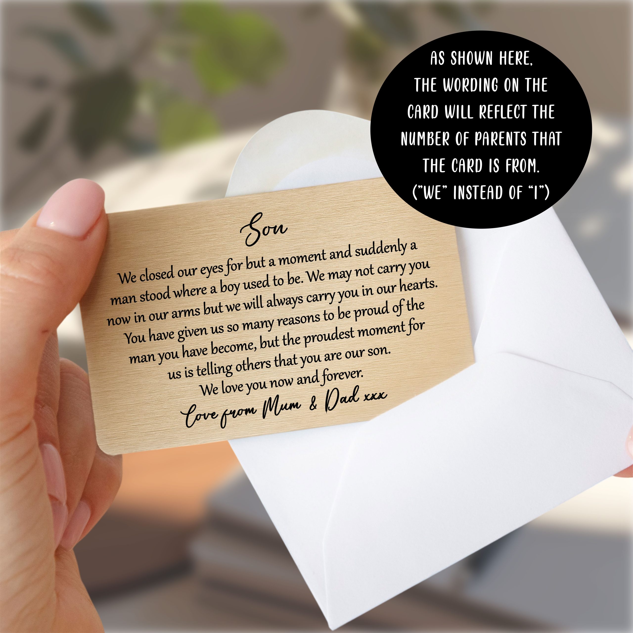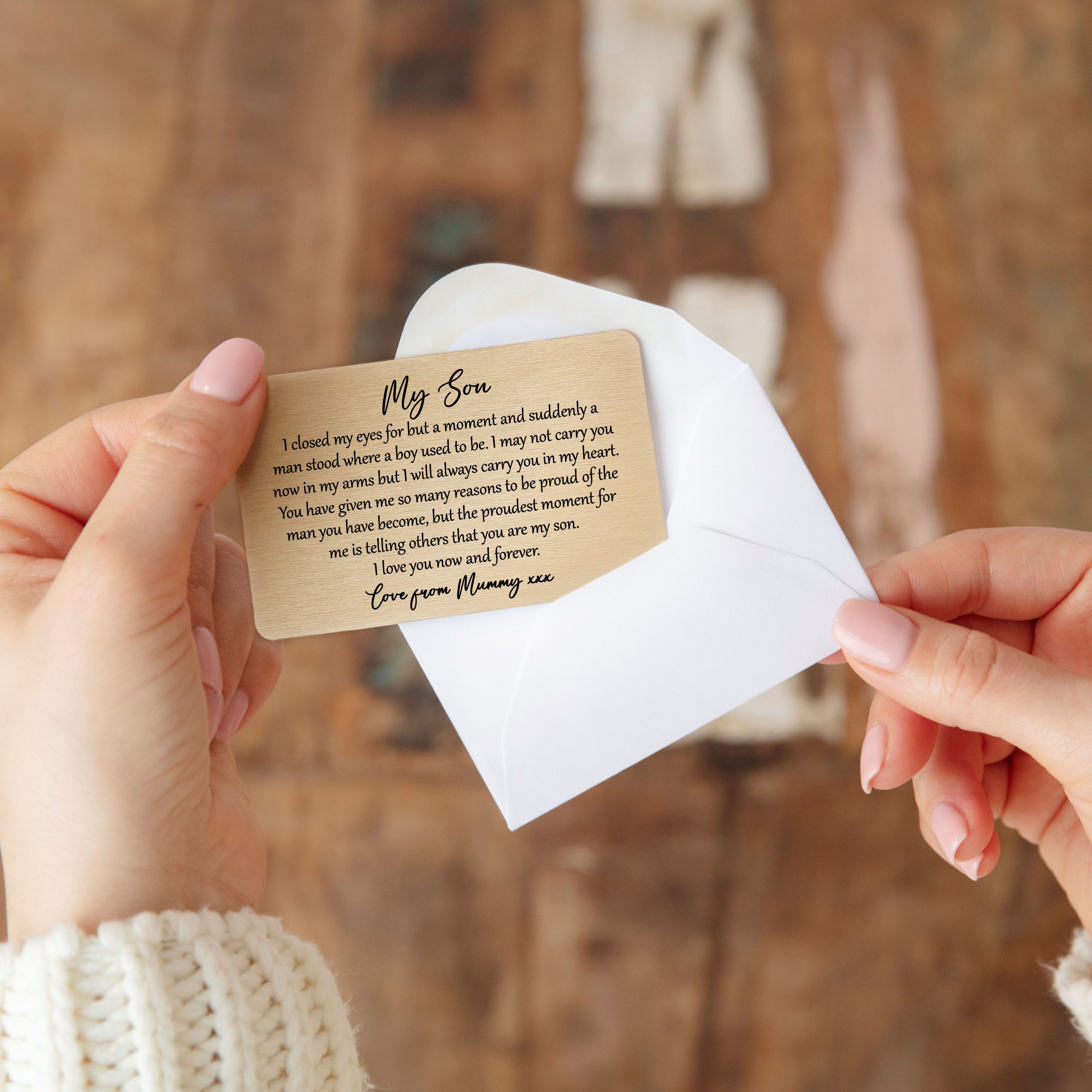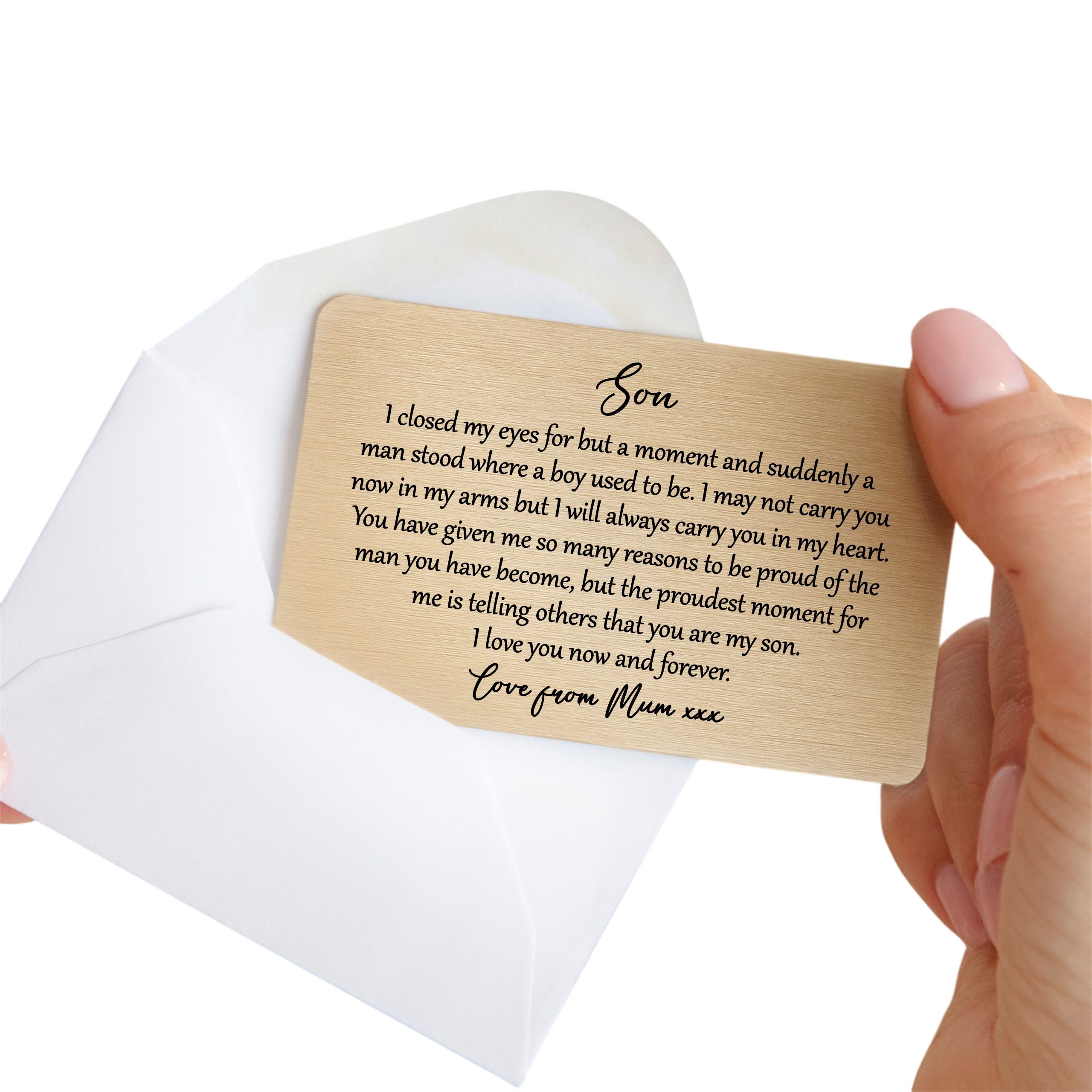 Looking for a deeply meaningful way to show your son just how much he means to you? ✨ Imagine his smile when he discovers this beautiful, enduring reminder of your love tucked safely in his wallet. This stunning metal gold keepsake offers a truly unique way to convey your heartfelt message, creating a lasting connection that he can carry with him everywhere. It’s more than just an item; it’s a constant whisper of your affection, a symbol of your unwavering pride, designed to be cherished for years to come.