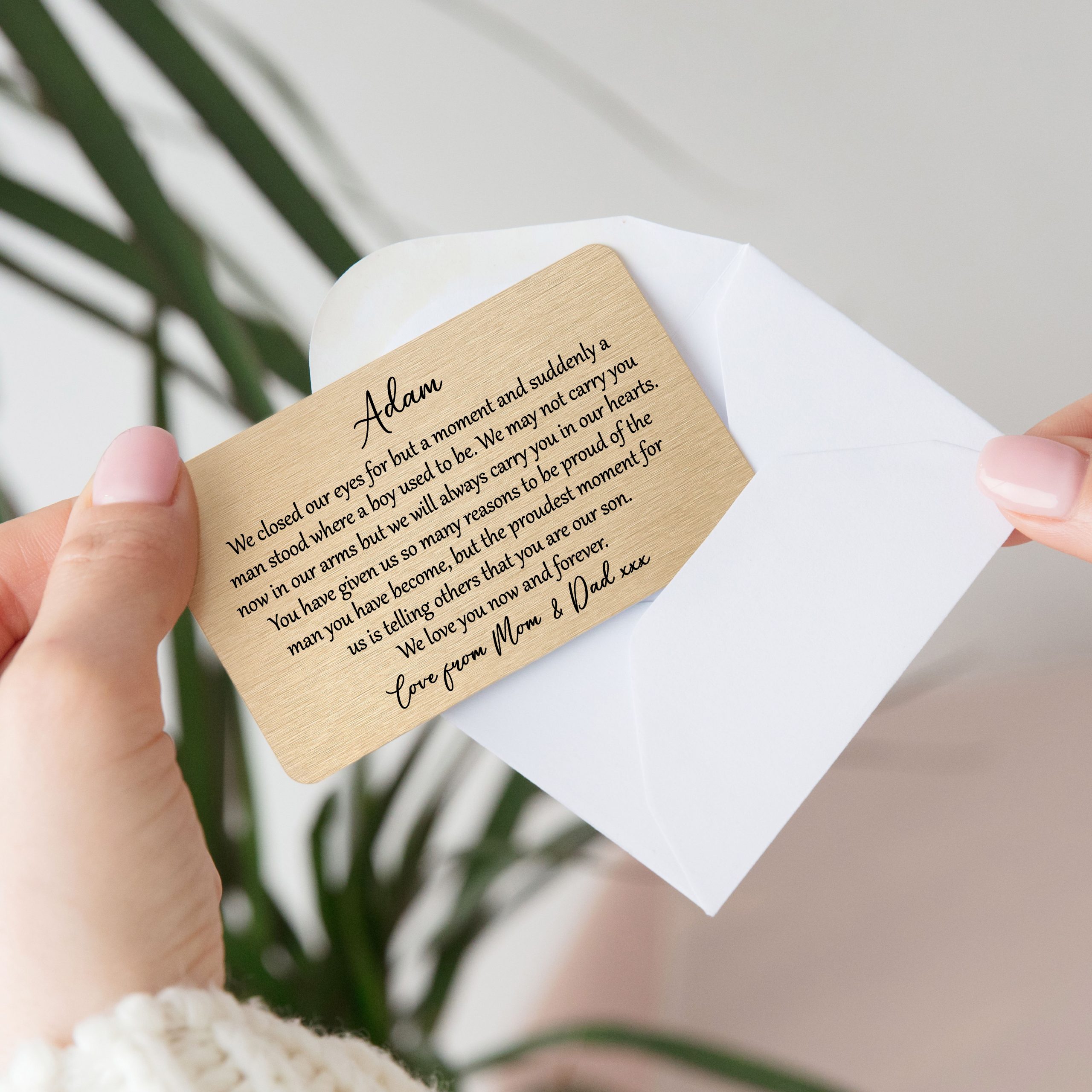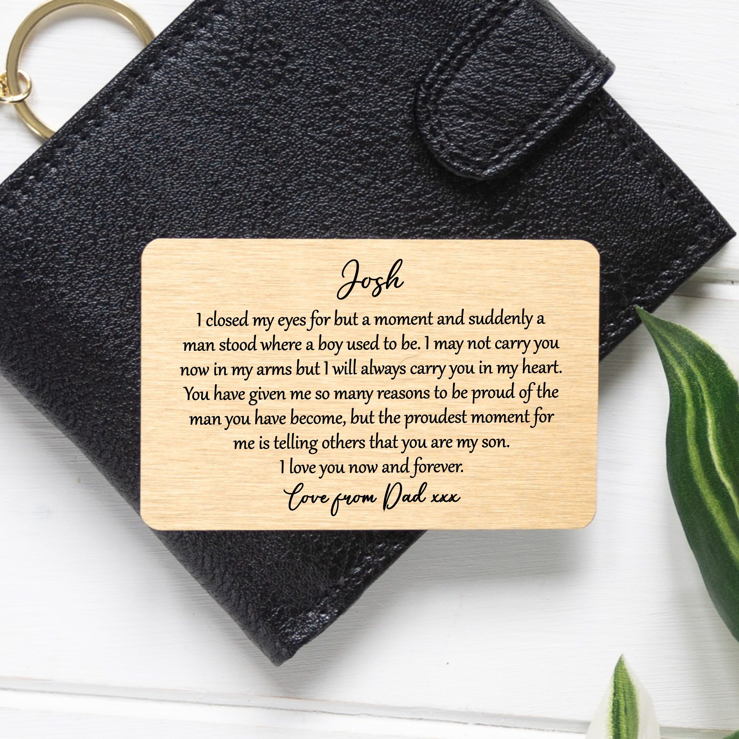 Give the enduring present that speaks volumes of your affection. This exceptional metal wallet card is a beautiful testament to the unbreakable bond you share, destined to become a cherished memento for a lifetime. Secure yours today and watch his face light up!
