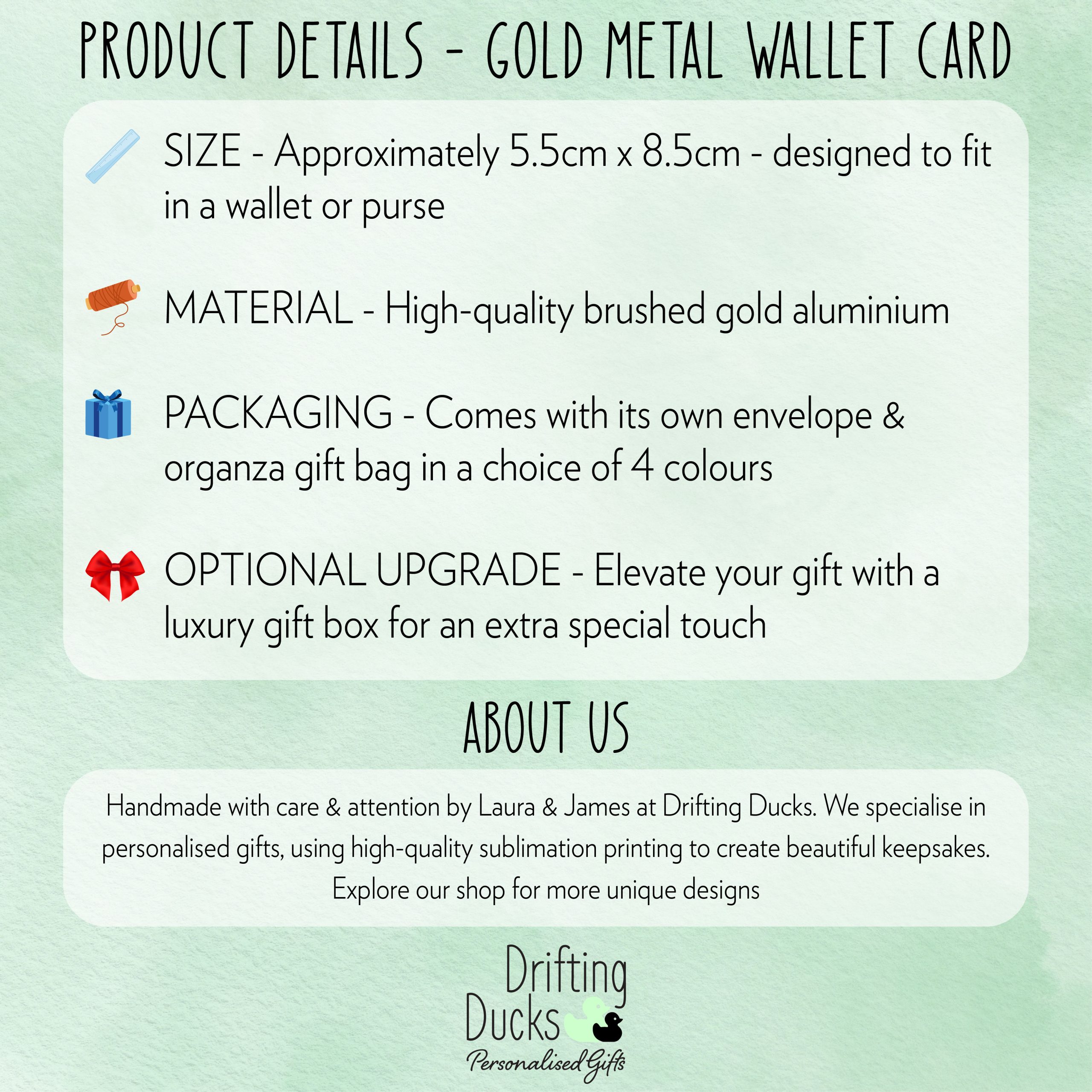 You can browse our full range of metal wallet cards here: https://www.driftingducks.co.uk/product-category/product-type/wallet-cards/