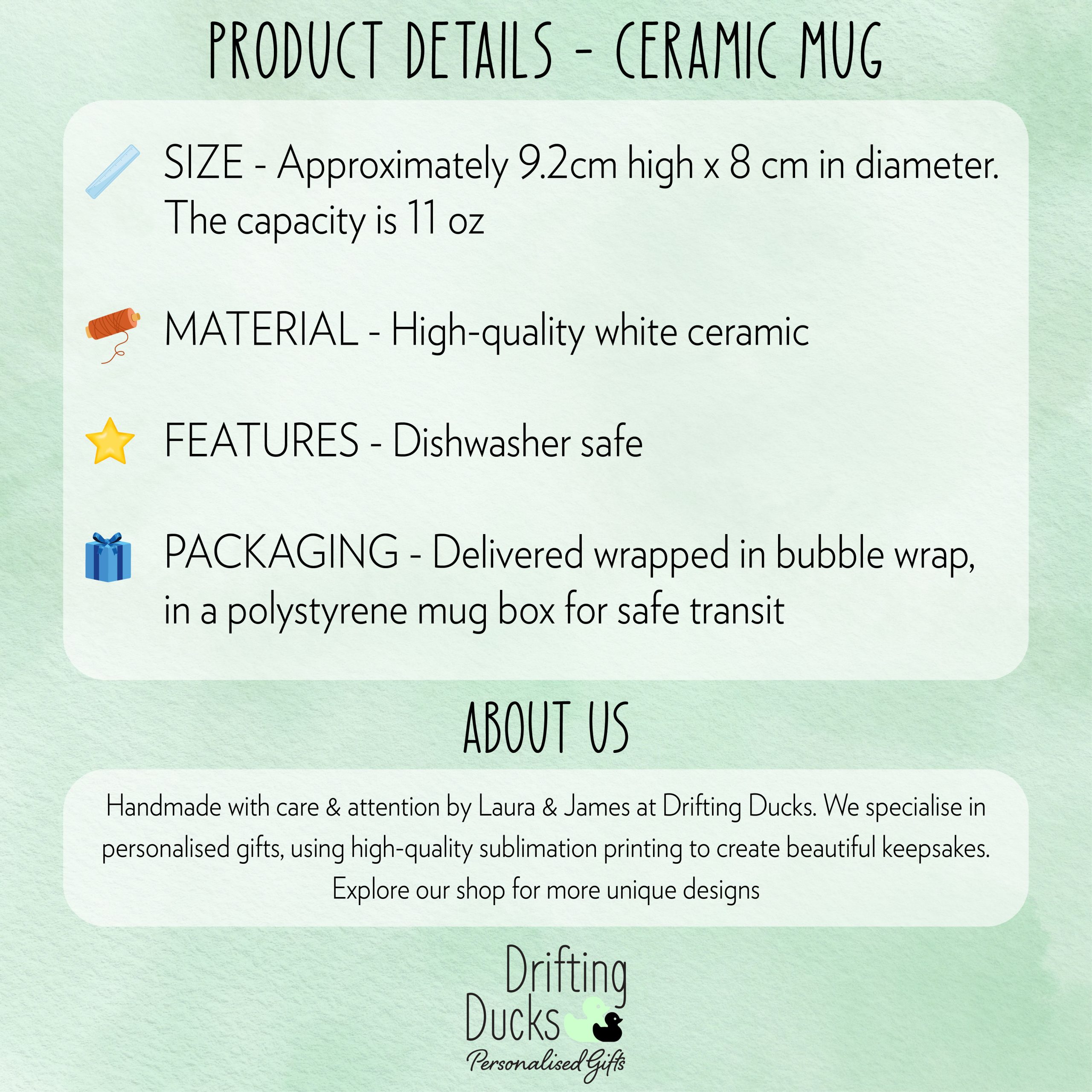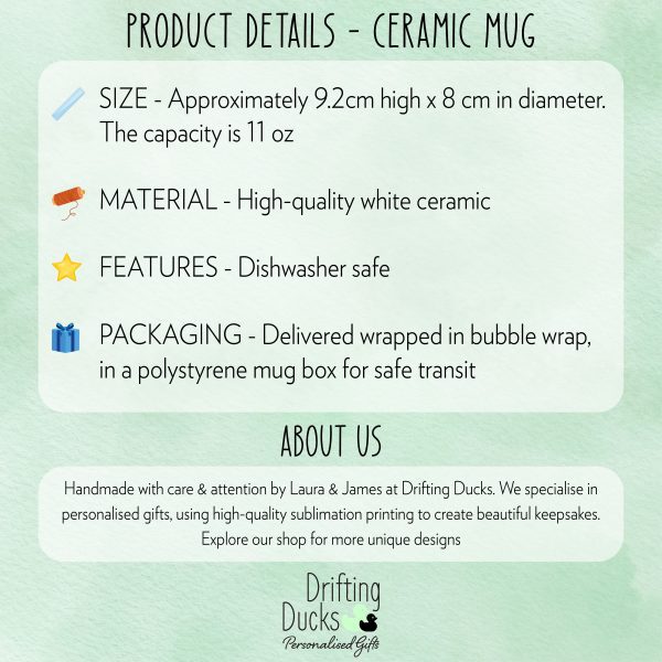 Handmade with love by James & Laura at Drifting Ducks. We specialise in personalised gifts using high-quality sublimation printing. Explore our shop for more unique designs.